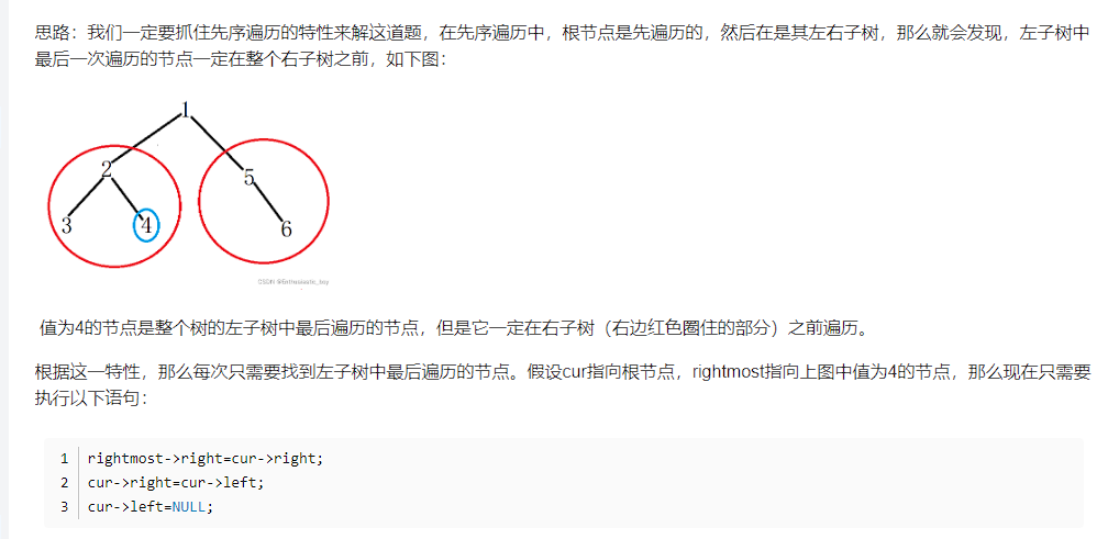 二叉树展开为链表 2022-11-11 11:55 > https://leetcode.cn/problems/flatten-binary-tree-to-linked-list/description/ ### 题目 给你二叉树的根结点 root ,请你将它展开为一个单链表: 展开后的单链表应该同样使用 TreeNode ,其中 right 子指针指向链表中下一个结点,而左子指针始终为 null 。 展开后的单链表应该与二叉树 先序遍历 顺序相同。 ### 思路 题解参考:https://blog.csdn.net/Enthusiastic_boy/article/details/122367693 重要的是这个点:找到当前节点左子树先序遍历的最后一个节点,然后把它挂在当前节点的右子树上,当前节点的左子树变右子树。顺序遍历当前节点直至为null即可。  ### 代码: ```java package com.example.demo.leecode; class TreeNode { int val; TreeNode left; TreeNode right; public TreeNode() { } public TreeNode(int val) { this.val = val; } public TreeNode(int val, TreeNode left, TreeNode right) { this.val = val; this.left = left; this.right = right; } } public class Solution { public static void main(String[] args) { TreeNode treeNode1 = new TreeNode(1); TreeNode treeNode2 = new TreeNode(2); TreeNode treeNode3 = new TreeNode(3); TreeNode treeNode4 = new TreeNode(4); TreeNode treeNode5 = new TreeNode(5); TreeNode treeNode6 = new TreeNode(6); treeNode1.left = treeNode2; treeNode1.right = treeNode5; treeNode2.left = treeNode3; treeNode2.right = treeNode4; treeNode5.right = treeNode6; Solution solution = new Solution(); solution.flatten(treeNode1); } public void flatten(TreeNode root) { if (root == null) { return; } TreeNode cur = root; while (cur != null) { TreeNode leftLastNode = getLeftLastNode(cur.left); if (leftLastNode != null) { leftLastNode.right = cur.right; cur.right = cur.left; cur.left = null; } cur = cur.right; } } //传入cur的left public TreeNode getLeftLastNode(TreeNode node) { if (node == null) { return null; } while (node.right != null) { node = node.right; } return node; } } ``` --END--