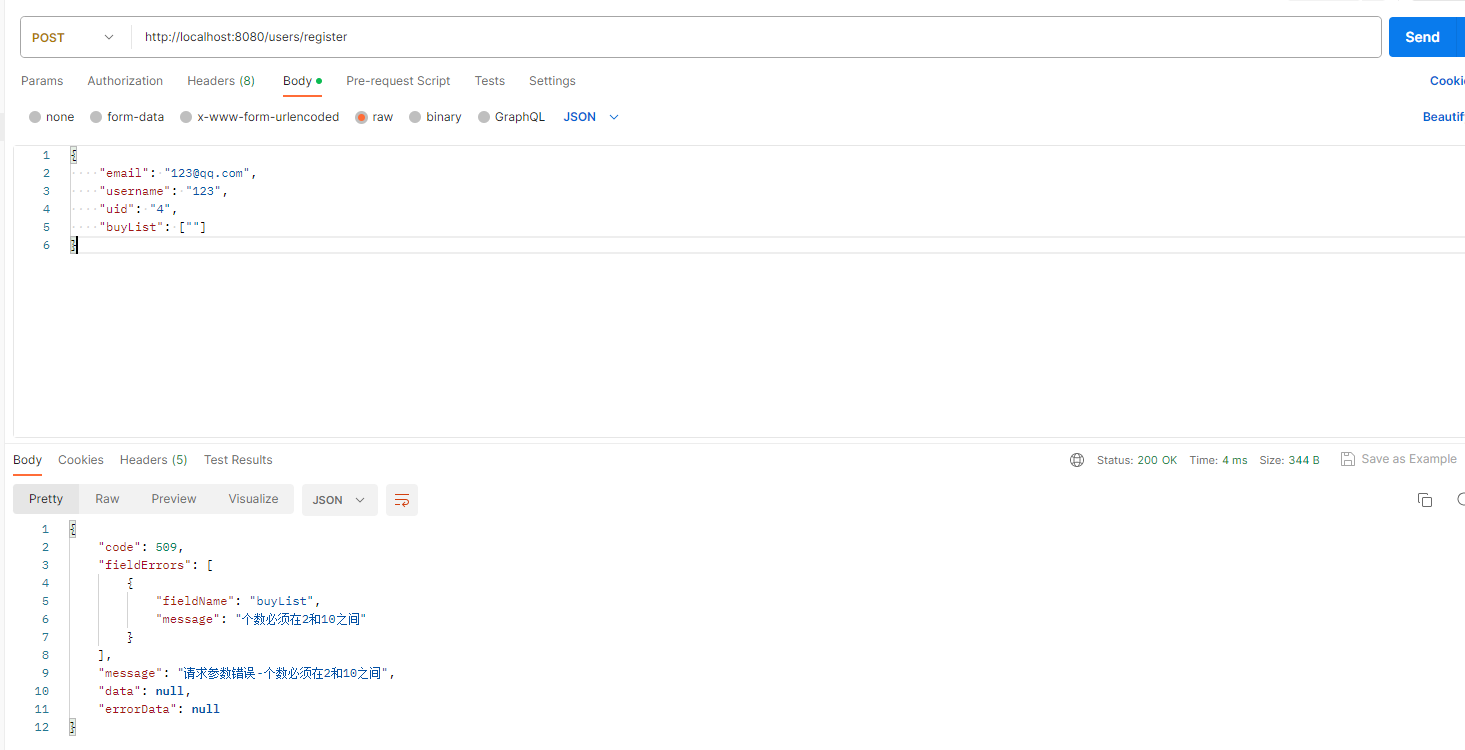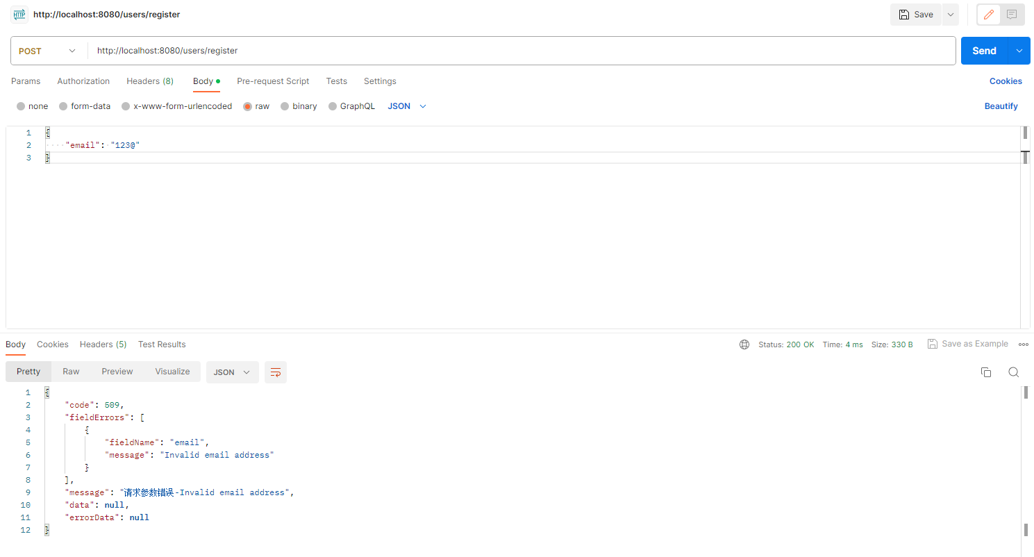 请求参数验证器的使用 2023-08-24 15:29 请求参数验证器的使用 本文内容:springboot中,使用注解验证请求参数。比如请求参数某个字段是否是email?是否是某些字符串中的一个?是否符合某种规则。 ### 1、依赖 ```xml <?xml version="1.0" encoding="UTF-8"?> <project xmlns="http://maven.apache.org/POM/4.0.0" xmlns:xsi="http://www.w3.org/2001/XMLSchema-instance" xsi:schemaLocation="http://maven.apache.org/POM/4.0.0 https://maven.apache.org/xsd/maven-4.0.0.xsd"> <modelVersion>4.0.0</modelVersion> <parent> <groupId>org.springframework.boot</groupId> <artifactId>spring-boot-starter-parent</artifactId> <version>2.7.14</version> <relativePath/> <!-- lookup parent from repository --> </parent> <groupId>com.example</groupId> <artifactId>WebDemo</artifactId> <version>0.0.1-SNAPSHOT</version> <name>WebDemo</name> <description>WebDemo</description> <properties> <java.version>1.8</java.version> </properties> <dependencies> <dependency> <groupId>org.springframework.boot</groupId> <artifactId>spring-boot-starter-web</artifactId> </dependency> <dependency> <groupId>org.springframework.boot</groupId> <artifactId>spring-boot-starter-validation</artifactId> </dependency> <dependency> <groupId>com.alibaba.nacos</groupId> <artifactId>nacos-common</artifactId> <version>2.2.0</version> </dependency> <dependency> <groupId>org.projectlombok</groupId> <artifactId>lombok</artifactId> <optional>true</optional> </dependency> <dependency> <groupId>org.springframework.boot</groupId> <artifactId>spring-boot-starter-test</artifactId> <scope>test</scope> </dependency> </dependencies> <build> <plugins> <plugin> <groupId>org.springframework.boot</groupId> <artifactId>spring-boot-maven-plugin</artifactId> <configuration> <excludes> <exclude> <groupId>org.projectlombok</groupId> <artifactId>lombok</artifactId> </exclude> </excludes> </configuration> </plugin> </plugins> </build> </project> ``` ### 2、注解及验证器 自定义注解: ```java package com.example.webdemo.common.annotation; import com.example.webdemo.validator.EmailValidator; import javax.validation.Constraint; import javax.validation.Payload; import java.lang.annotation.*; //作用在字段上 @Target({ElementType.FIELD}) //运行期间有效 @Retention(RetentionPolicy.RUNTIME) //指定验证器为EmailValidator @Constraint(validatedBy = EmailValidator.class) public @interface ValidEmail { String message() default "Invalid email address"; //所属验证组,必填,JSR-303规范.可用于分组验证 Class<?>[] groups() default {}; Class<? extends Payload>[] payload() default {}; } ``` 编写验证器校验注解标注的字段内容: ```java package com.example.webdemo.validator; import com.example.webdemo.common.annotation.ValidEmail; import javax.validation.ConstraintValidator; import javax.validation.ConstraintValidatorContext; /** * Email验证器 * <ValidEmail, String> :<作用的注解, 作用的数据类型> * String,表示将来要处理的字段类型是String类型的,所以此注解不能标注在其他类型的字段上做校验 */ public class EmailValidator implements ConstraintValidator<ValidEmail, String> { //初始化 @Override public void initialize(ValidEmail constraintAnnotation) { } /** * 验证 * @param email object to validate * @param context context in which the constraint is evaluated * * @return false标识不通过, true表示通过 */ @Override public boolean isValid(String email, ConstraintValidatorContext context) { if (email == null) { return false; } // 这里可以添加自定义的邮箱验证逻辑,这里只是一个简单的示例 return email.matches("[A-Za-z0-9._%+-]+@[A-Za-z0-9.-]+\\.[A-Za-z]{2,4}"); } } ``` ### 3、全局异常拦截及统一返回体 ```java package com.example.webdemo.exception; import com.alibaba.nacos.common.utils.CollectionUtils; import com.example.webdemo.common.response.CommonApiCode; import com.example.webdemo.common.response.ResponseVO; import lombok.extern.slf4j.Slf4j; import org.springframework.http.HttpStatus; import org.springframework.validation.FieldError; import org.springframework.web.bind.MethodArgumentNotValidException; import org.springframework.web.bind.annotation.ExceptionHandler; import org.springframework.web.bind.annotation.ResponseBody; import org.springframework.web.bind.annotation.ResponseStatus; import org.springframework.web.bind.annotation.RestControllerAdvice; /** * 全局异常拦截 */ @RestControllerAdvice @Slf4j public class WebExceptionHandler { /** * 拦截MethodArgumentNotValidException异常,当参数校验失败时会抛出此异常 * @param e * @return */ @ExceptionHandler(value = MethodArgumentNotValidException.class) @ResponseStatus(HttpStatus.OK) @ResponseBody public ResponseVO<Object> handleMethodArgumentNotValidException(MethodArgumentNotValidException e) { ResponseVO<Object> vo = new ResponseVO<>(); for (FieldError item : e.getBindingResult().getFieldErrors()) { String itemMessage = item.getDefaultMessage(); vo.addFieldError(item.getField(), itemMessage); } vo.setCode(CommonApiCode.FIELD_ERRORS.getCode()); vo.setMessage(CommonApiCode.FIELD_ERRORS.getMessage()); if(CollectionUtils.isNotEmpty(vo.getFieldErrors())){ vo.setMessage(CommonApiCode.FIELD_ERRORS.getMessage() + "-" + vo.getFieldErrors().get(0).getMessage()); } return vo; } @ExceptionHandler(Exception.class) @ResponseStatus(HttpStatus.OK) @ResponseBody public ResponseVO<Object> handleException(Exception e) { log.error(e.getMessage(), e); ResponseVO<Object> vo = new ResponseVO<>(); vo.setCode(CommonApiCode.ERROR.getCode()); vo.setMessage(CommonApiCode.ERROR.getMessage()); return vo; } } ``` 返回码定义: ```java package com.example.webdemo.common.response; import lombok.Getter; /** * 接口返回码定义 */ @Getter public enum CommonApiCode implements IAPICode { /** 统一返回码 **/ SUCCESS(200, "成功"), /** * 安全 */ BAD_REQUEST(400, "请求错误"), NO_AUTH(401, "请登录"), NO_PERMISSIONS(403, "无权限"), DATA_NOT_FOUND(404, "资